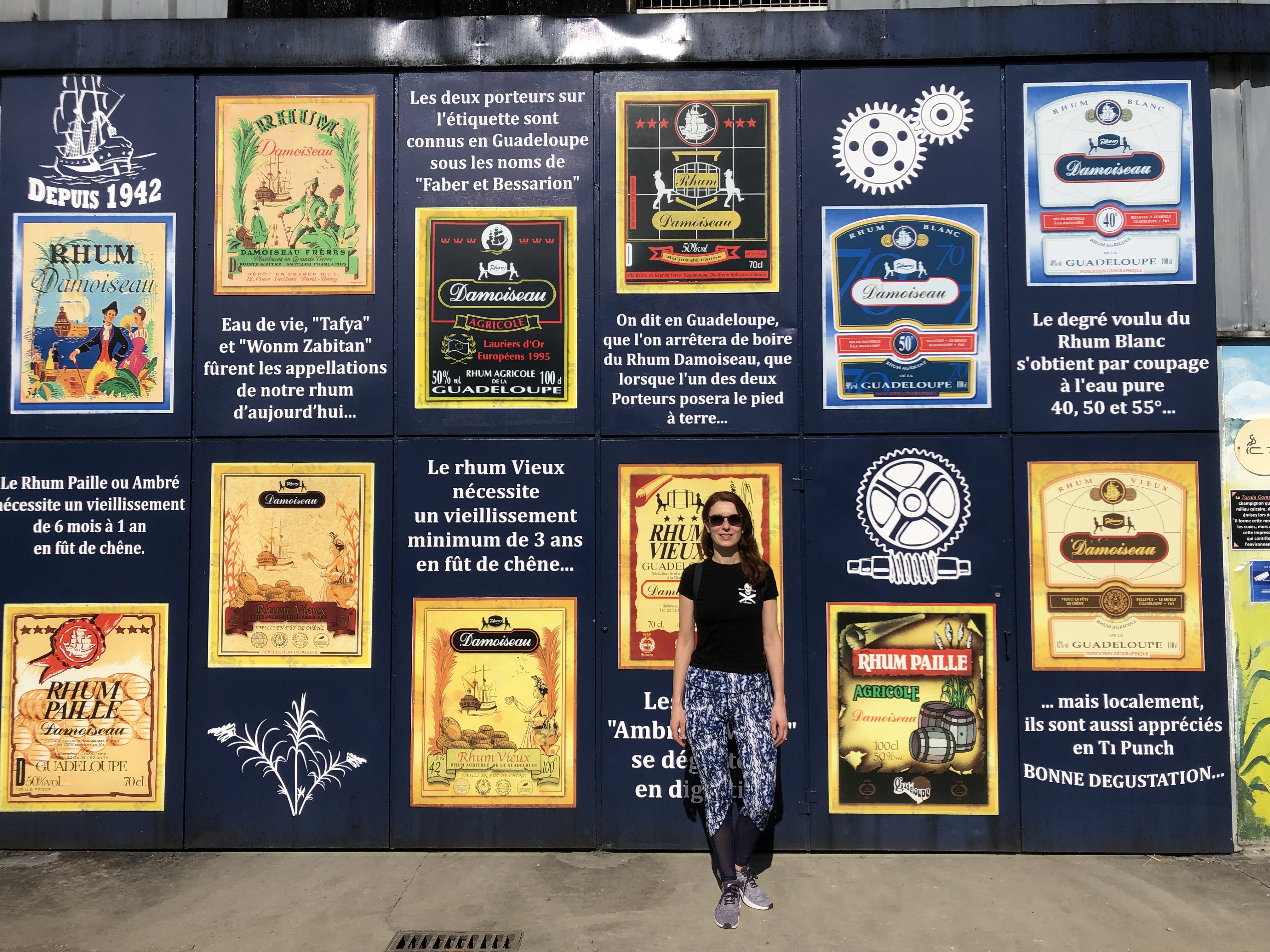 Appena scostato, subito a destra, lo shop con prodotti Damoiseau, rhum, merchandising e verrerie, è già ben popolato, nonostante sia molto presto. Mi avvio per il vialetto che conduce all’impianto di distillazione, lungo il quale sono esposti antichi macchinari, ottima introduzione per visitatori esperti e meno. La distilleria dall’esterno ha un aspetto imponente e moderno, nonostante proprio davanti campeggi, in bella mostra, accanto al nastro traportatore per la canna da zucchero, la vecchia machine à vapeur, tutta colorata e ben oliata, pronta per i futuri raccolti. Gli operai sono intenti alla manutenzione, necessaria prima della partenza della stagione, e tra loro mi viene incontro Dimitri, che mi fa una rapida panoramica dell’impianto, recentemente rinnovato con altre colonne di distillazione (ne conto ben 5, di grande dimensione, oltre ad una dozzina di grandi cuve di fermentazione, guardando dall’alto di una piattaforma, dalla quale si gode una vista magnifica sui campi circostanti e sulla distilleria). Sono colonne dalla grande portata, non a caso Damoiseau distribuisce più di 2 milioni di litri, di cui il 75% in Guadeloupe e nei Caraibi, attestandosi come leader sia in questi mercati che in Francia, dove è il rhum agricolo più consumato. Dimitri mi dice che, purtroppo, essendo sabato, non sarà possibile visitare gli chais d’invecchiamento, e questo mi lascia un po’ contrariata. Vorrà dire che tornerò appena possibile in settimana.