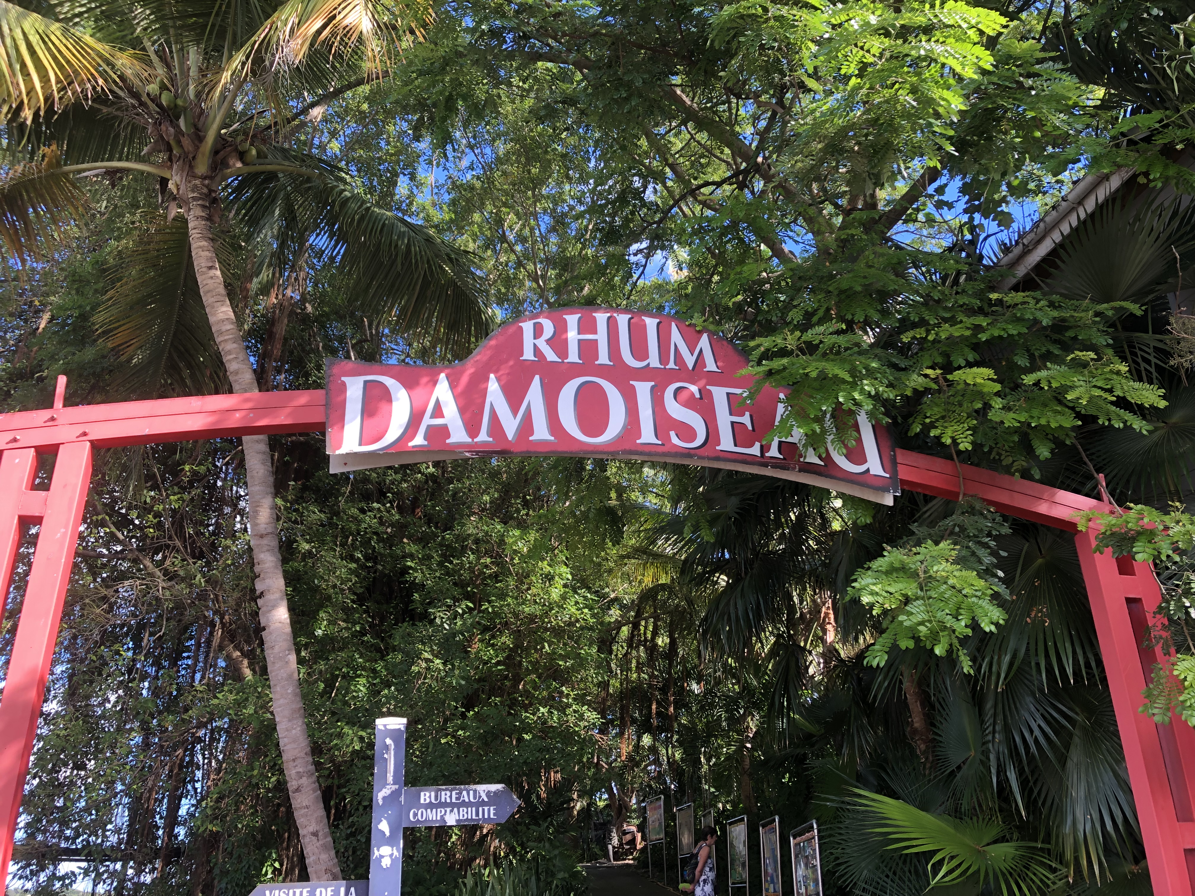 La strada per la distilleria è piuttosto agevole, ed arrivo velocemente. Campi di canna da zucchero mi circondano: è mattino presto ma il sole è già alto. In distilleria, in assenza di Jonathan Damoiseau, mi accoglierà Dimitri, suo fratello, che, tuttavia, è impegnato in varie attività, quindi la mia visita si svolge piuttosto in solitaria. L’ingresso è ben visibile dalla strada principale: un arco con la grande scritta Damoiseau accoglie i visitatori su di un bel cortile coltivato a prato verde, in cui campeggia una enorme riproduzione di una bottiglia del loro rhum blanc.