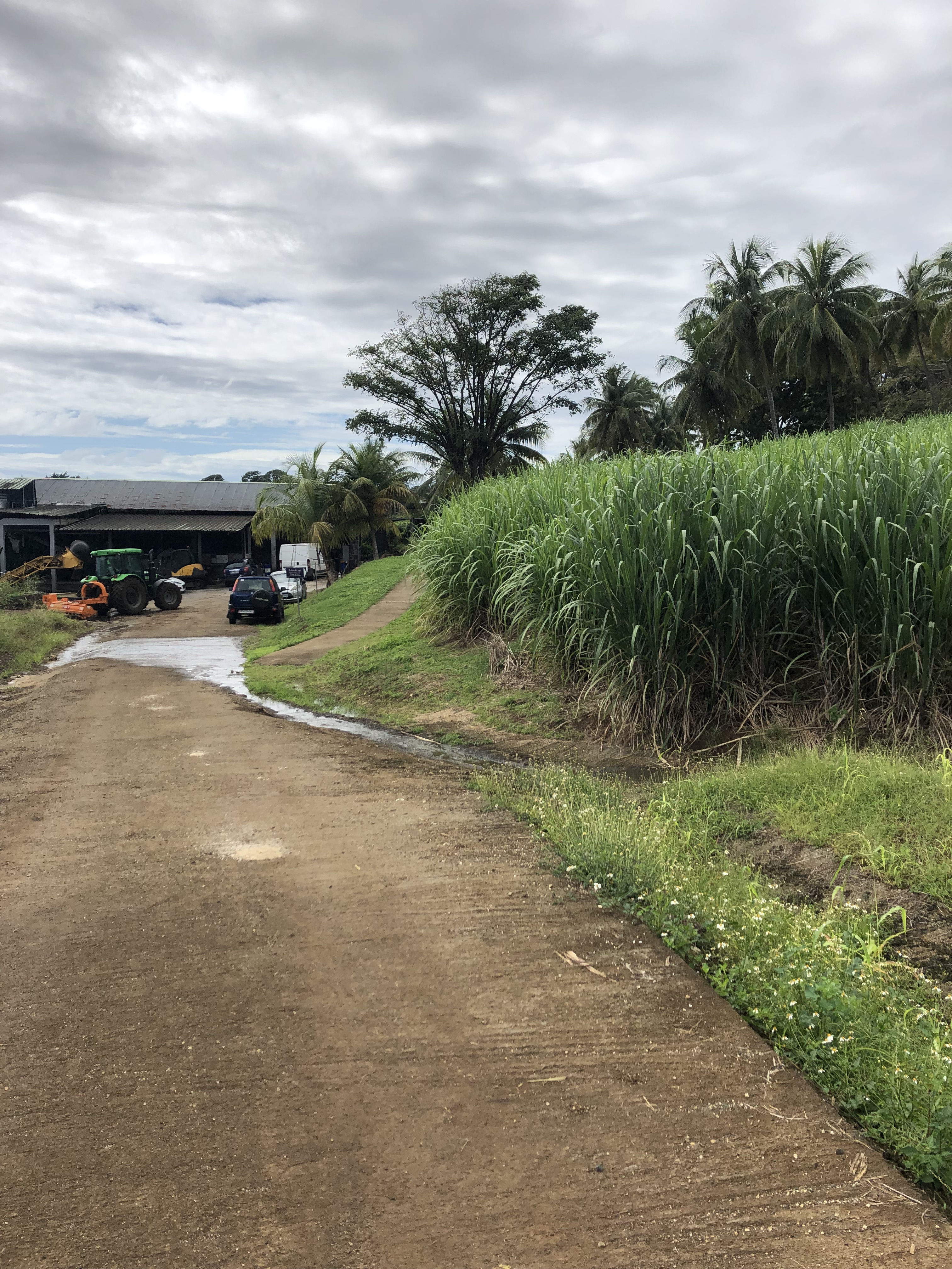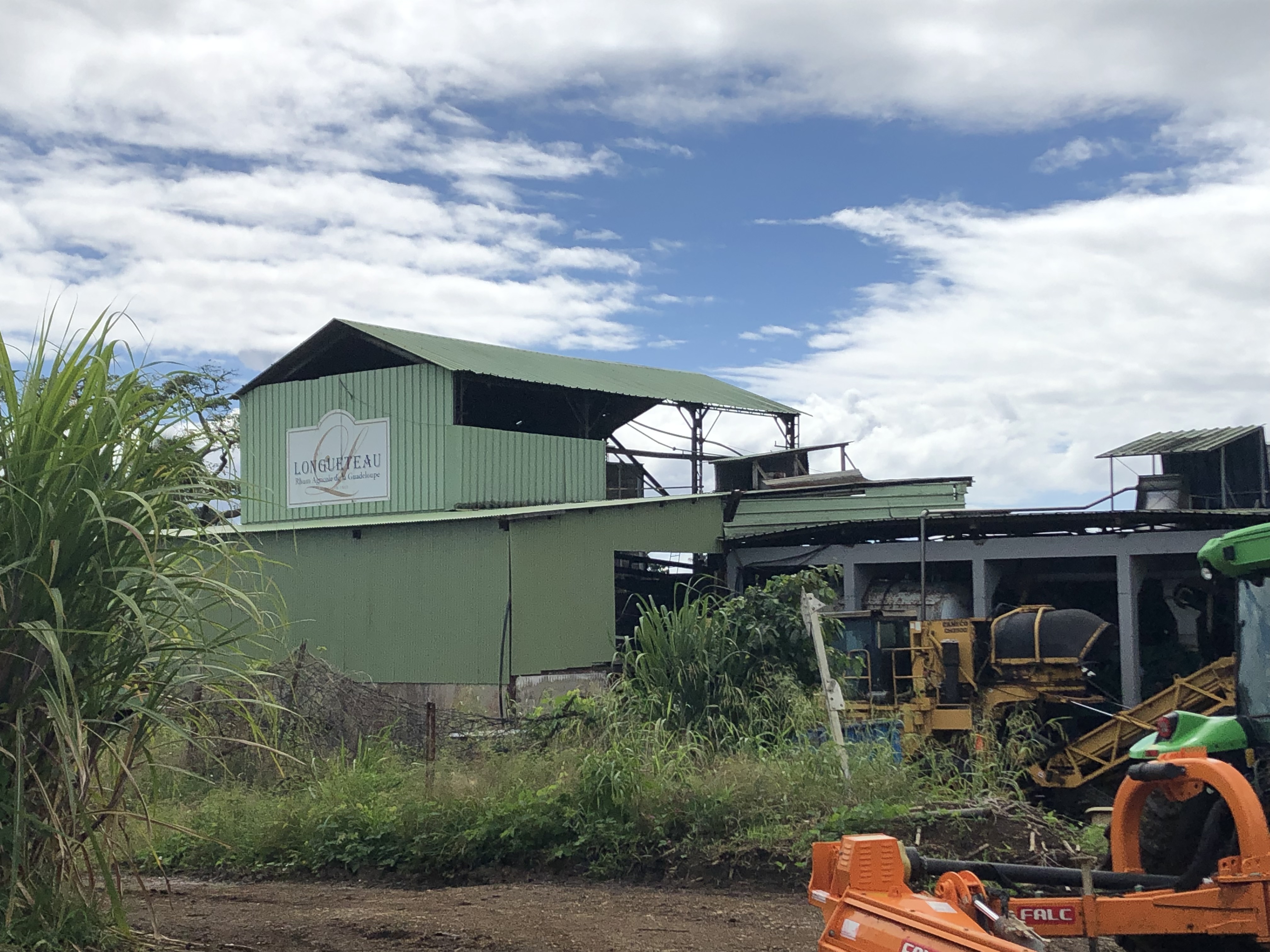 Eccomi giunta al bivio, dove un panneau mi indica chiaramente la direzione per la distilleria: eh sì, la distilleria è una soltanto, e produce rhum per Longueteau e Karukera. La proprietà è di Longueteau: attorno tantissima canna da zucchero, a perdita d’occhio, riconosco canne rouge soprattutto, una varietà antica che è molto coltivata in Guadalupa e Marie Galante, con risultati diversi, molto duttile, carica di sentori di frutta tropicale, spezie e dolcezza erbacea.