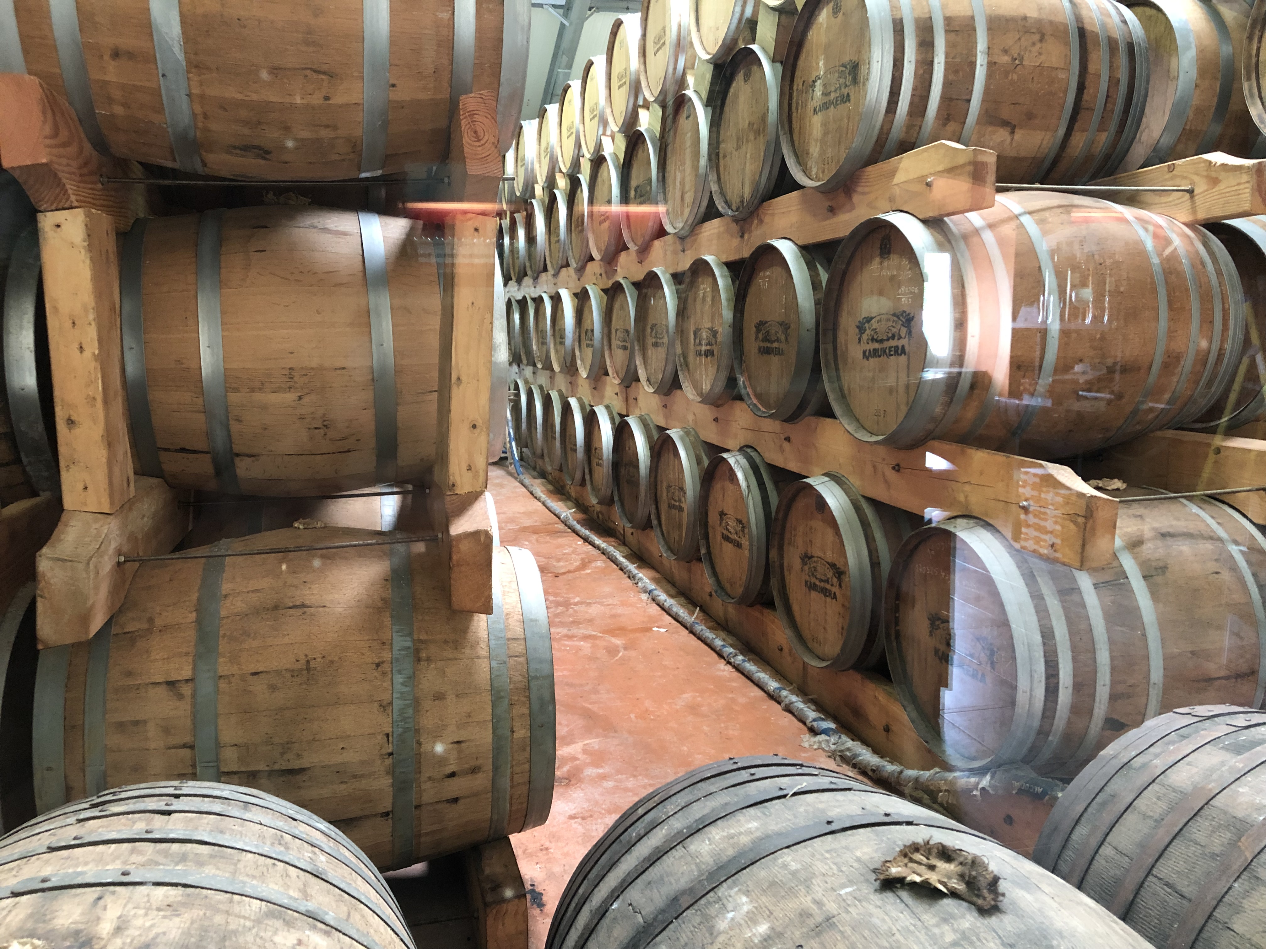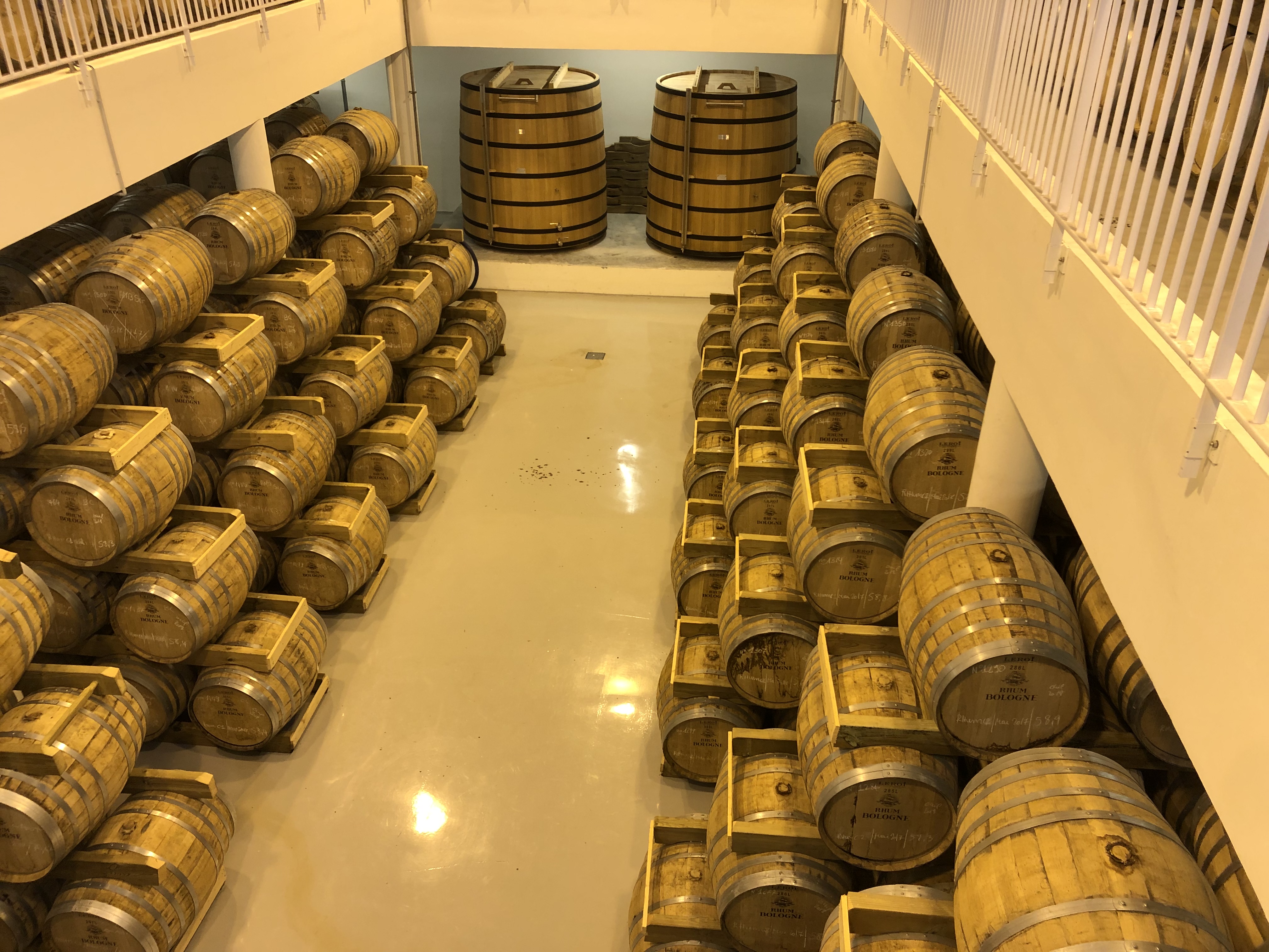 Da ultimo, visito lo chais, che avevo intravisto all’inizio: è un locale moderno, dall’atmosfera controllata, dove stazionano grandi Foudres da 4000 lt, e varie tipologie di botti, delle quali la maggior parte sono ex-Cognac, da 350 lt., e solo alcune ex bourbon: l’invecchiamento in queste botti conferisce ai rhum vieux Bologne gradevoli note di frutta a polpa bianca e gialla, ed una speziatura leggera, bordata da un tannino gallico decisamente docile, che li rende prodotti di grande finezza e distinzione.