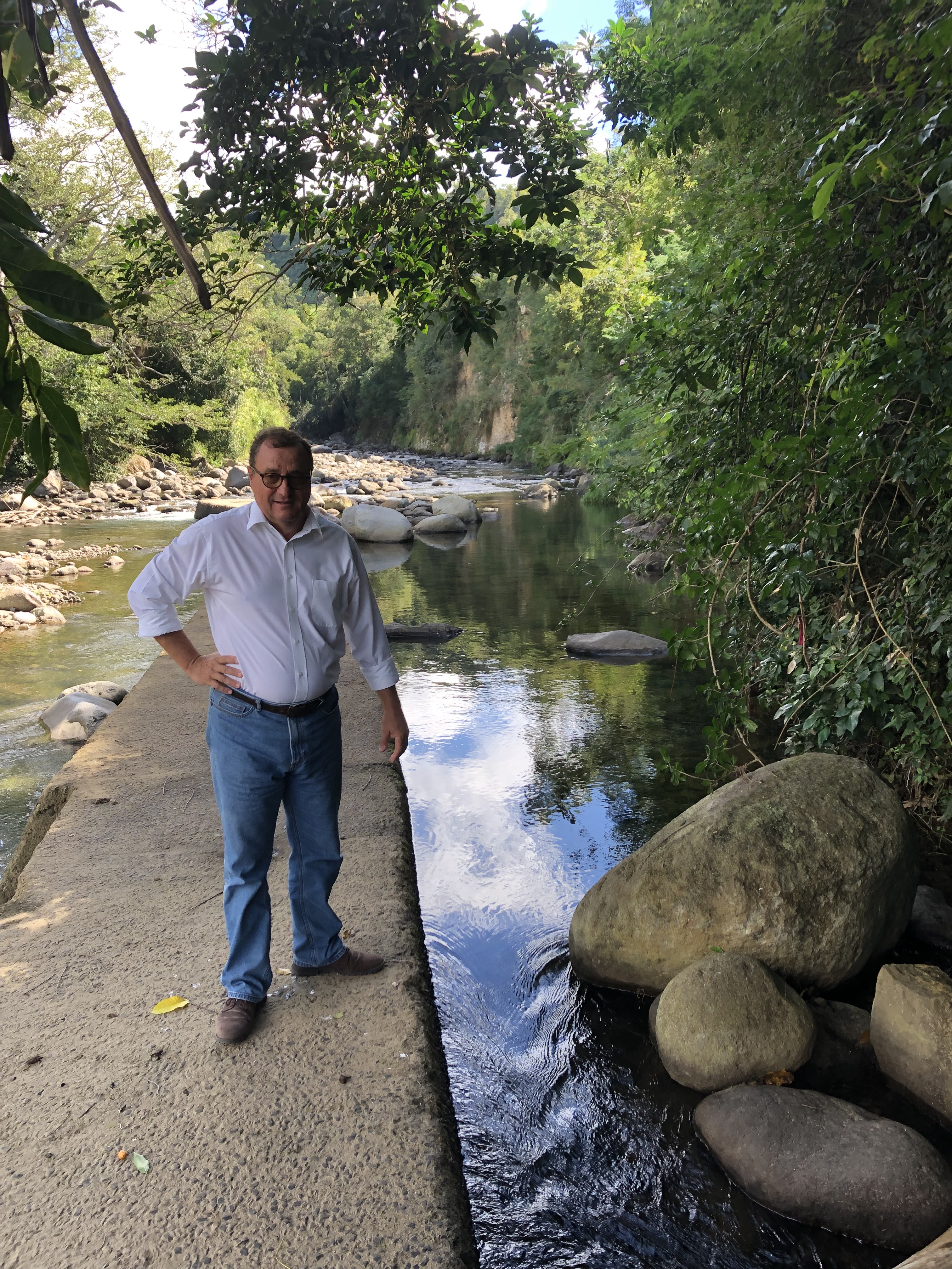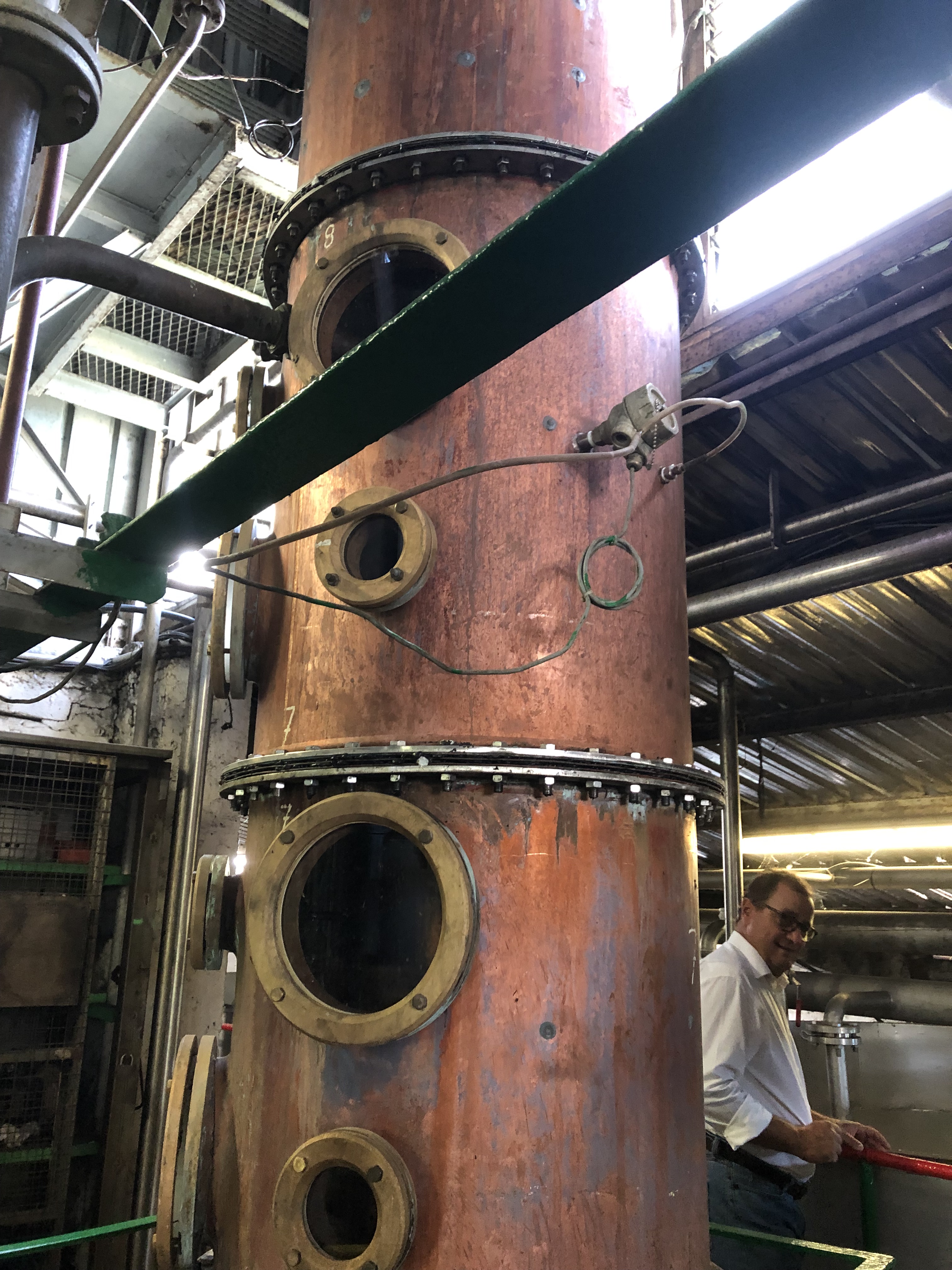 Mi viene incontro l’enologo, Frederic, che mi dà il benvenuto e mi lascia nelle mani del Direttore Generale, François: inizia il mio tour di tutto il domaine, sul fuoristrada aziendale, non prima di aver visitato il cuore della distilleria e dato il buongiorno a tutti gli operai intenti a pulizia e manutenzione: il fulcro della produzione sono due magnifiche colonne, una colonna créole, chiamata “Gilbert”, ed una più grande colonna Savalle. Con la piccola créole si producono i famosi bianchi, soprattutto un parcellare che adoro, di pura canne noire, “La Coulisse”, ed il Black Cane. Terminato il giro interno, saltiamo sul 4×4 alla scoperta della piantagione, che si estende fin sotto il cono della Soufrière, ed ha la fortuna, oltre a svilupparsi su suolo vulcanico, di essere attraversata da un bel corso d’acqua che garantisce il fabbisogno necessario alle operazioni di brouillage e di pulizia alla distilleria. Bologne da tempo ha deciso per una gestione “parcellare” del suo domaine, dove si coltivano varie tipologie di canna da zucchero tra cui la regina è appunto la Canne Noire, una varietà che, come la Canne Grise, era inizialmente coltivata su Barbados, e poi è stata esportata qui. Una particolare parcella con esposizione al tramonto e sita ai piedi della Soufrière è la parcella detta “coulisse” proprio a causa del corso d’acqua che la attraversa: François mi conduce fin sotto il corso d’acqua e passiamo con la jeep proprio accanto alla parcella, dove la canna sta crescendo bene ma ancora non è pronta per la raccolta: il corso d’acqua è di portata notevole, sembra un fiumiciattolo delle nostre Alpi, l’acqua è fresca e pulita. Proseguiamo, tra pendenze notevoli e terreni accidentati, dove solo i planteur si avventurano per tagliare, ed arriviamo all’ultima parcella, coltivata completamente in biologico, con utilizzo della lotta integrata per scongiurare parassiti ed erbacce. Da qui si gode una vista eccezionale sulla Soufrière e sul mare: gli appezzamenti sono perfettamente esposti ad Ovest, con la brezza marina a mitigare le temperature elevate, e godono di un terreno cui il vulcano conferisce una eccezionale mineralità. Tornati alla base, ringrazio François per questo avventuroso tour e per avermi dedicato la sua mattinata, e vengo rapita da Fred per qualche degustazione “sottobanco” nel suo laboratorio personale, dove nascono tutte le nuove creature che verranno immesse sul mercato: si sta preparando in particolare l’uscita di un nuovo “brut de colonne” che verrà lanciato al Rhum Fest di Parigi, sempre di canne noire: i sample che assaggiamo sono tutti attorno ai 72% ABV, ancora giovani e bisognosi di riposo, ma la traccia minerale ed oleosa, ed il carattere balsamico e fumé della canne noire emergono potentemente, con una grande schiettezza e personalità. Qualcosa di buono si sta preparando, sotto la guida e l’esperienza di Fred, che in questi ultimi anni ha letteralmente rinnovato il volto di Bologne.