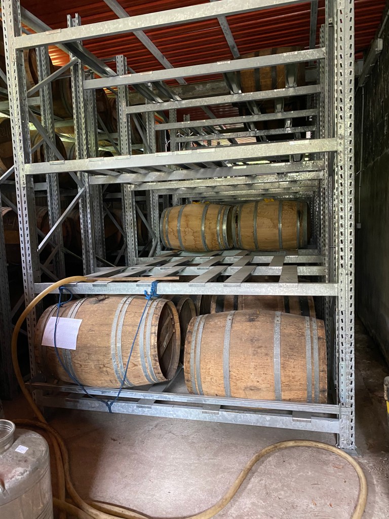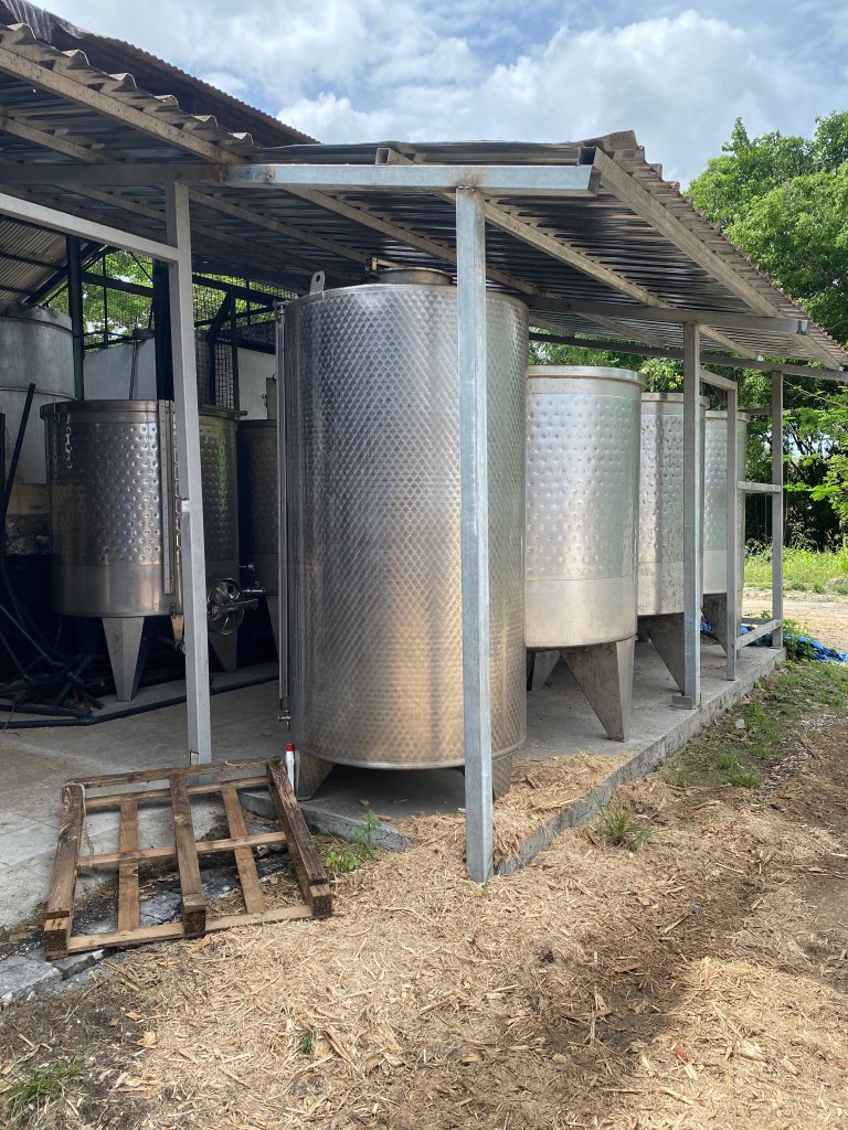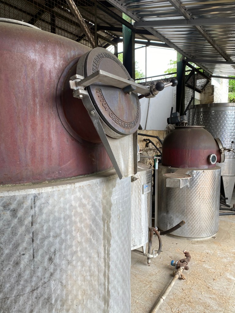 Visto che il gruppo è in ritardo, posso utilizzare il tempo per fare qualche domanda in più a Michele, sotto lo sguardo benevolo dei due Muller, ancora senza la parte terminale, che si apprestano a ricominciare a brevissimo la loro avventura: si conta infatti di iniziare con le prime prove proprio in Agosto, e con la vera e propria campagna di produzione a partire dal 2022, riportandosi al regime standard di 2400 litri di succo lavorato al giorno, a dare circa 200 litri di rhum agricole a 80% ABV. Ricordo qui che Rhum Rhum, come pochi altri agricoles al mondo, è prodotto a partire da puro succo non diluito con acqua durante l’estrazione. La diluizione, o meglio, il brassage, avviene solo a prodotto finito, e con acqua del cielo.
