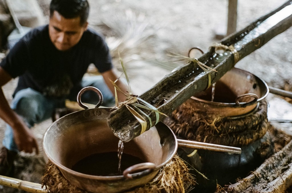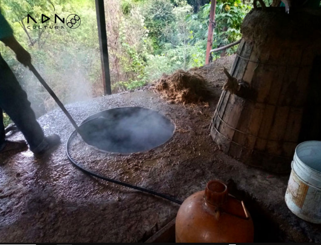 Nel mondo dei distillati di Agave, invece, non sempre le fibre scoperte della piña sono materiale da filtrare via in sede di fermentazione e distillazione, anzi, servono a comporre uno spirito di carattere: queste fibre contengono i fruttani, gli zuccheri fermentescibili dell’agave (catene di fruttosio), e sono esposte tramite cottura e frantumazione delle piñas, con l’aiuto dell’acqua. Il metodo di cottura, frantumazione ed esposizione, così come la fermentazione, dipendono dal tipo di spirito e dalla modernità dell’impianto, ma, à savoir, nel mondo del Mezcal artesanal e ancestral, dove non sono ad esempio ammessi forni differenti da hornos de pozo o mamposteria, e smembratori diversi dalla tahona (grande ruota in pietra), o dai martelli (e anche shredders per artesanal), le fibre di agave, raccolte post processing, sono utilizzate non solo nei campi o nelle successive cotture, ma anche nelle fermentazioni (più lunghe sono, più carattere avrà lo spirito, anche grazie alla strabiliante flora batterica in grado di svilupparsi sulle fibre), e, in seguito, nell’alambicco, soprattutto se si tratta dell’alambicco tradizionale in terracotta (“olla de barro”), insieme al liquido fermentato e sul primo e secondo sigillo della olla, sotto la “culebra” e sopra la “cuchara”: le olle, riscaldate a fuoco diretto, hanno bisogno della mano esperta di un distillatore, che abbia pieno controllo del calore e della reazione di Maillard che avviene nell’alambicco, che effettui i tagli in modo frequente e preciso, ad ogni fiotto di distillato, e che componga il blend finale. Le fibre di agave gli permetteranno di donare allo spirito il tono affumicato, juicy e fresco che un buon Mezcal Joven deve avere. Quasi nessun Tequila invece utilizza le fibre dell’agave durante la fermentazione e nell’alambicco, sia perché il mercato del Tequila è completamente diverso, sia perché gustativamente ci si attende una maggior linearità, per cui, le fermentazioni sono brevi e molto controllate: spesso le fibre vengono completamente esaurite degli zuccheri esposti tramite enzimi prima di essere scartate. Valle Siembra è un Tequila fabbricato ancora in modo tradizionale dove la fibra gioca il suo ruolo. Altre parti vegetali della piña, come le foglie e il cogollo, germoglio che costituisce il primo segno del quiote, ovvero della fioritura (e morte, con conseguente perdita di tutto lo zucchero) che viene tagliato dai produttori, sono generalmente scartate, perché ricche di cere oppure troppo “vegetali”, come spesso accade soprattutto nelle grandi produzioni, dove si cerca, per essere consistenti, di “centrare” una maturità media delle agavi, che oggi comprende l’inserimento di esemplari non del tutto maturi nel raccolto (ricordo che l’Agave Tequilana Weber giunge a maturità in 7-10 anni, ma il mercato è ovviamente più veloce e demanding). Detto ciò, lo stile segue sempre l’idea produttiva, anche dietro le grandi macchine del mondo Tequila, infatti Ocho qualche foglia la tiene, mentre le piña di Patron sono bianche come la neve, così come in alcuni casi un cogollo nel processo intero si tiene per avere qualche aroma di “cottura” e qualche complessità in più.